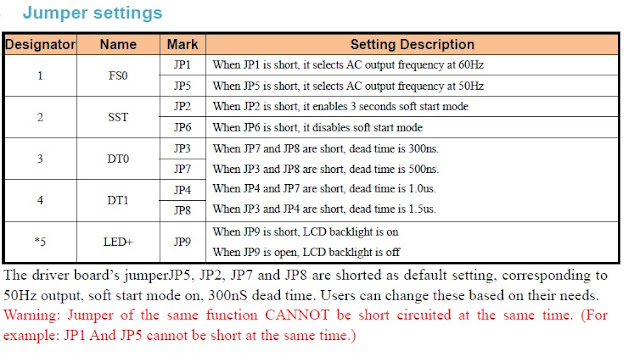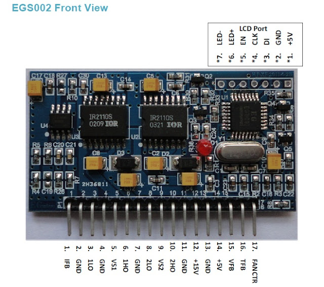 EGS002 is an already made 17pins plug and play driver board specific for single phase sinusoidal inverter. It uses ASIC EG8010 as control chip and IR2110S as driver chip. The driver board integrates functions of voltage, current and temperature protection, LED warning indication and fan control. Jumper configures 50/60Hz AC output, soft start mode and dead time.